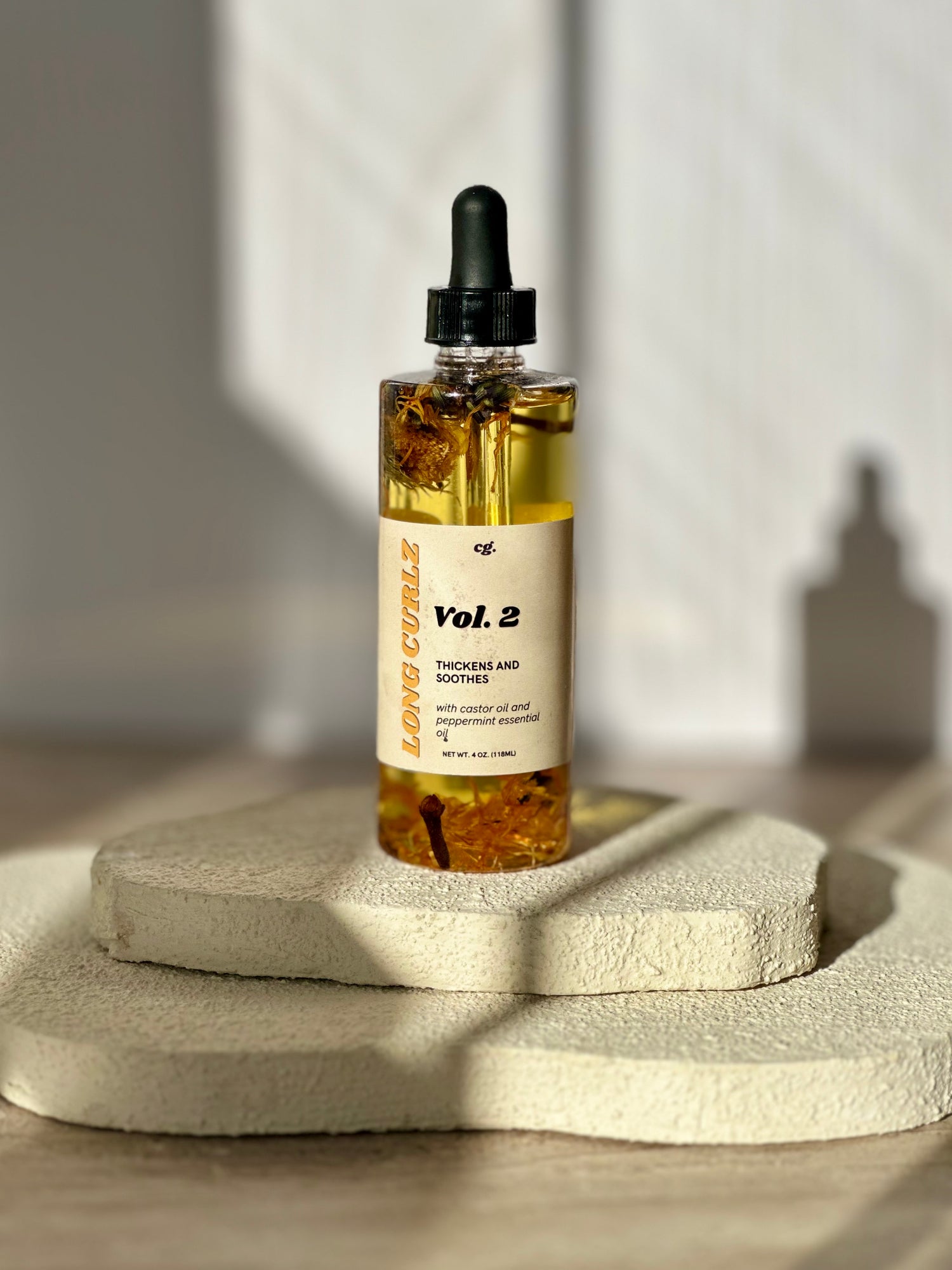 Long Curlz Vol 2 is a deeply nourishing hair growth oil designed to strengthen curls and promote healthy scalp function. It features castor oil, which improves blood circulation to hair follicles and supports growth through its high ricinoleic acid content; jojoba oil, a natural sebum mimic that moisturizes without clogging pores, helping maintain scalp balance; and peppermint essential oil, scientifically shown to stimulate blood flow and encourage hair follicle activity. For best results, apply a few drops directly to the scalp and massage a few times a week—no rinsing needed—to boost circulation and support long-lasting curl health.